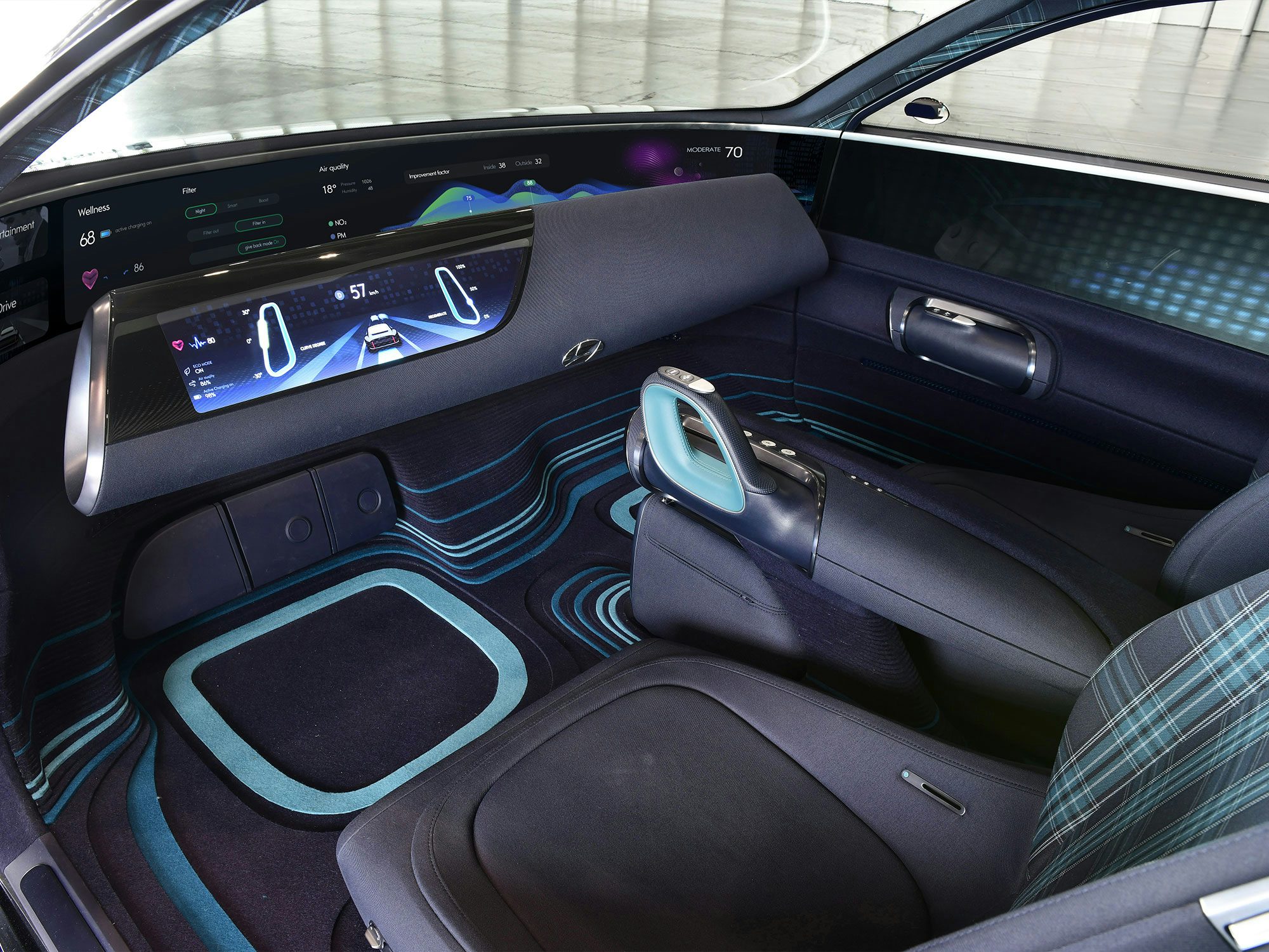 Il design avvolgente del cruscotto potrebbe apparire sull’auto finita, e vale la pena incrociare le dita affinché Hyundai offra la Ioniq 6 con gli accattivanti sedili scozzesi della Prophecy.
