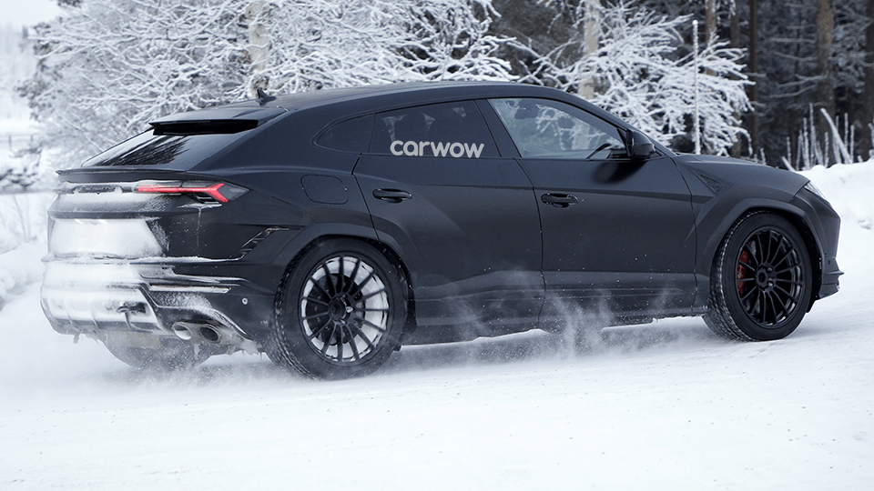 Un diffusore posteriore leggermente più aggressivo sembra nascondersi sotto una coltre di neve. Per il resto, la parte posteriore dell’Urus EVO sembra abbastanza simile all’auto attuale.