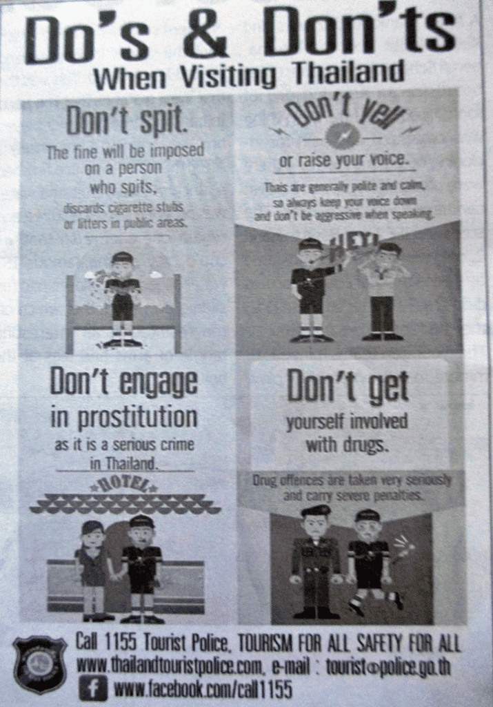 Alcuni messaggi curiosi sono elencati nell'annuncio. Sputare non è permesso. Un sacco di vecchi thailandesi, che masticavano noci di betel, vomitavano dappertutto. Macchie sporche e difficili da rimuovere, alcuni gruppi di cinesi sono anche noti per il loro comportamento sputato. Ma se sono colpiti da ciò che la polizia turistica annuncia tramite una pubblicità in inglese? "Non gridare" puoi leggere! Ci sono altre fonti di rumore! Discoteche che vanno avanti fino alle prime ore del mattino e sono seguite al mattino presto dai templi con i loro sistemi audio. Apparentemente solo il turista dovrebbe essere tranquillo.
