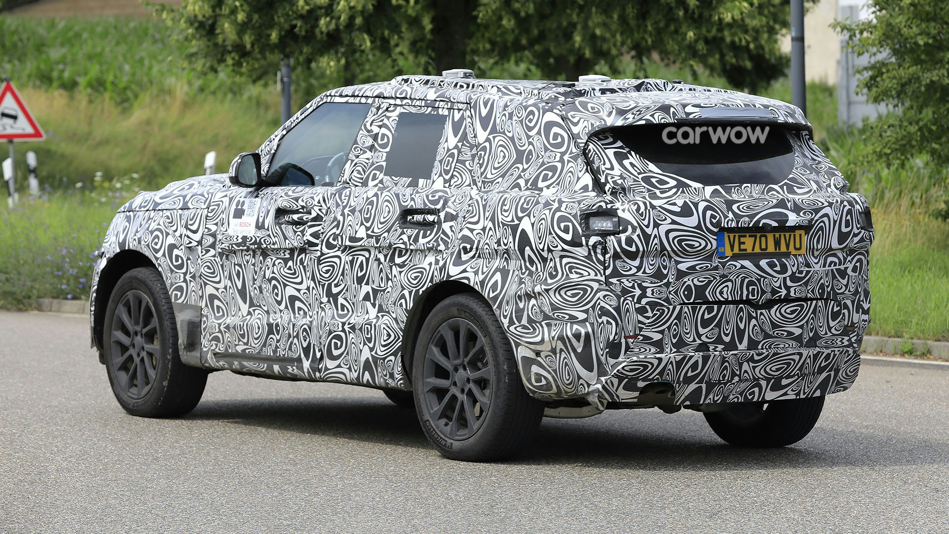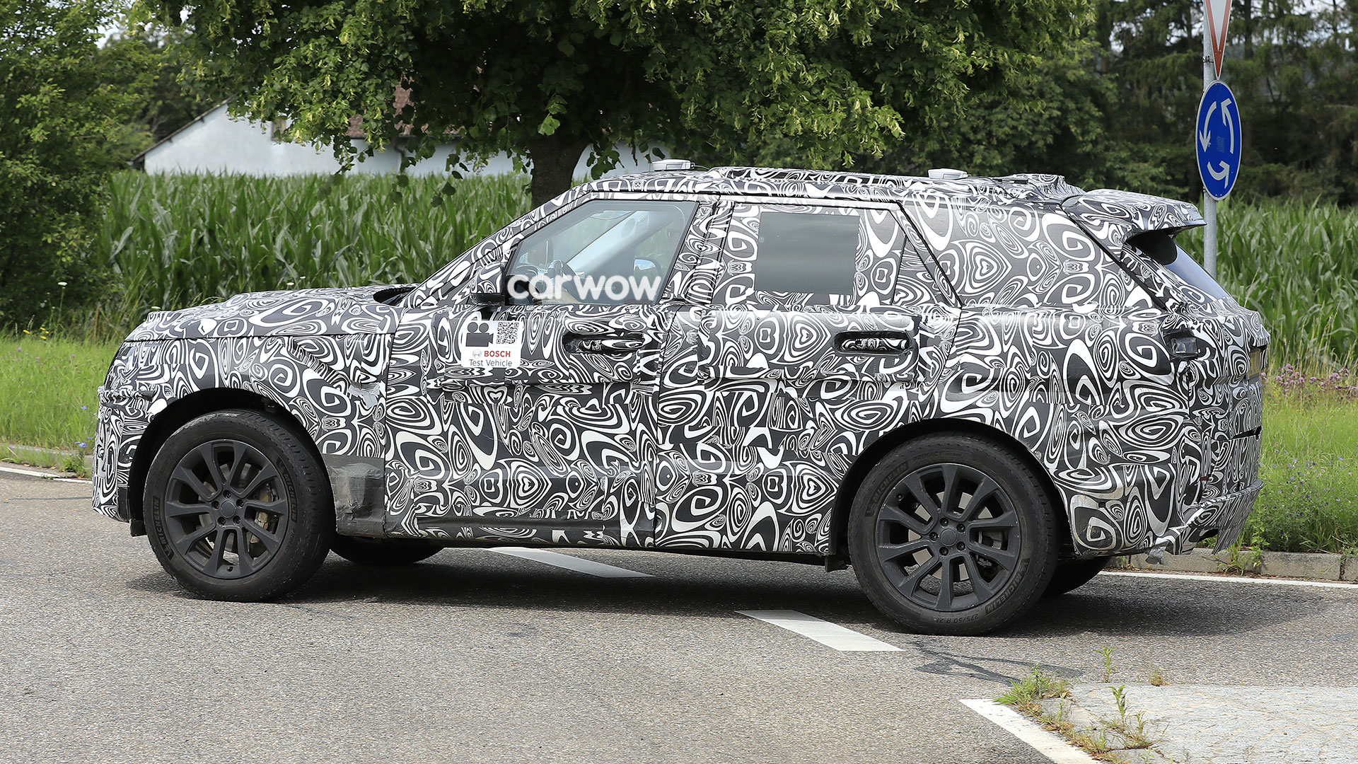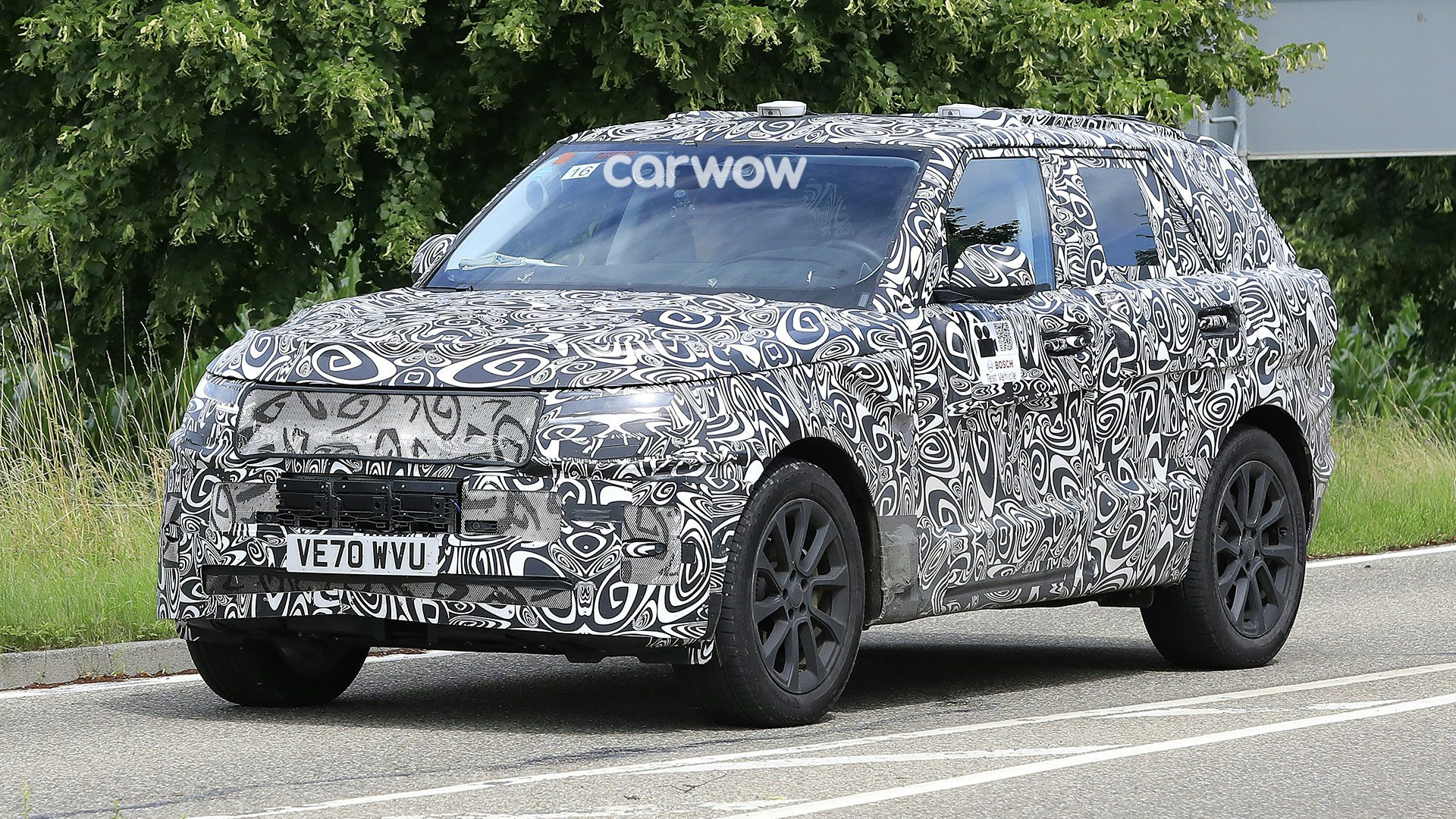Quegli strani piccoli dischi sul tetto e le piccole sporgenze dietro i passaruota anteriori potrebbero essere sensori e telecamere per il progetto di auto connessa del Regno Unito a cui stanno collaborando sia Bosch (che ha il suo logo sui lati dell’auto) che Land Rover.
