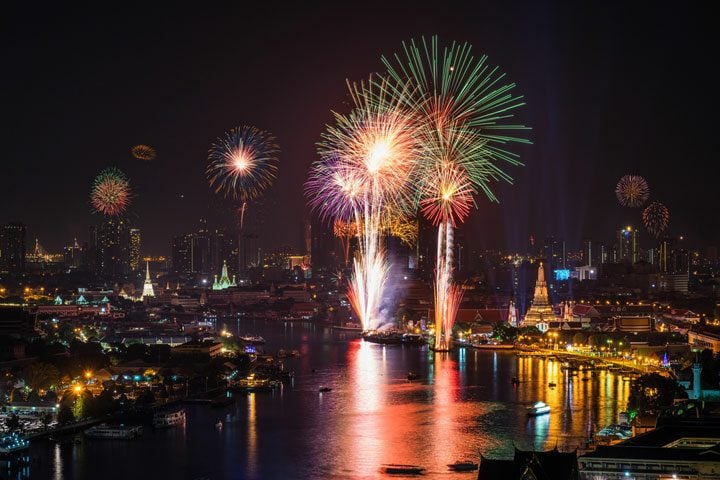 Il nuovo Iconsiam, un enorme complesso commerciale e di intrattenimento sulle rive del Chao Phraya, sarà pieno di fuochi d'artificio e altri spettacoli. C'è spazio per 4.000 spettatori.