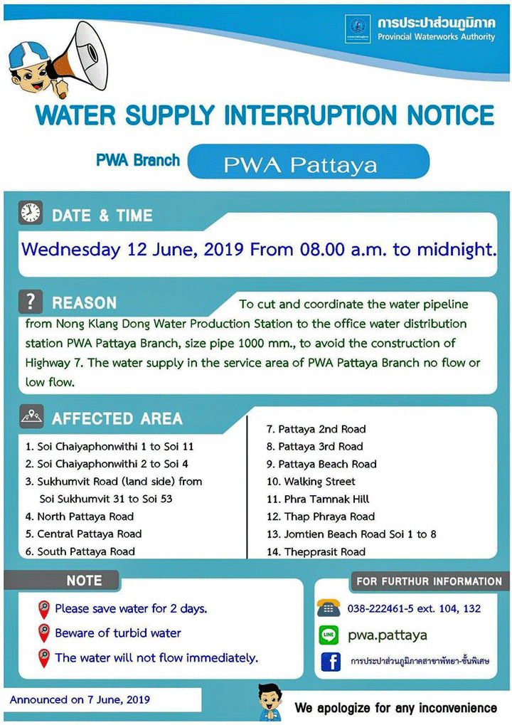 La società di acquedotti di Pattaya, PWA Pattaya, ha annunciato che a causa dei lavori sul sistema di condotte, la fornitura regolare di acqua verrà interrotta dalle 8:00 a mezzanotte.