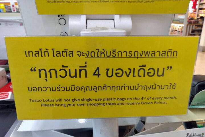 Sono stato in un Tesco Lotus il mese scorso e ho visto un cartello di avviso alla cassa: nessun sacchetto di plastica gratuito è stato fornito il 4 ° giorno del mese.