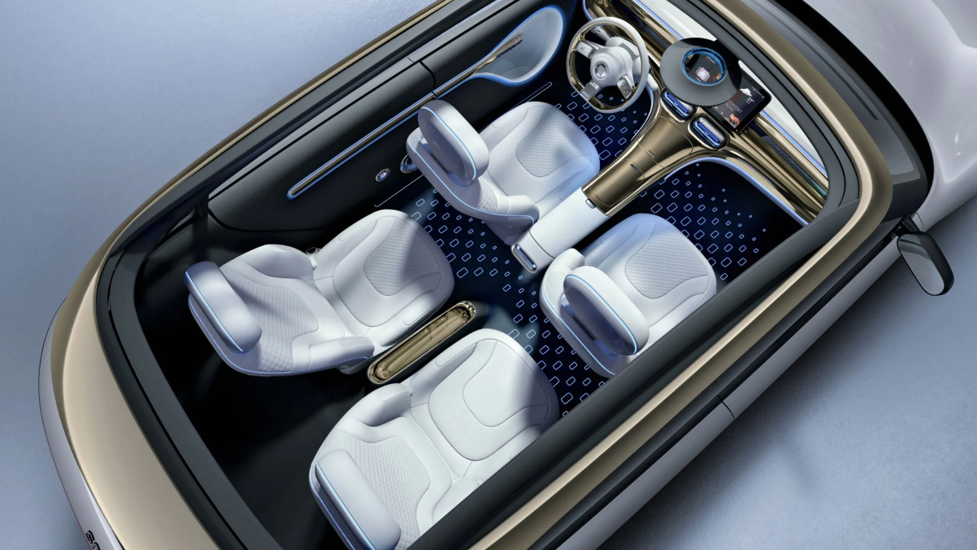 La parte posteriore ha lo stesso design del gruppo ottico posteriore a LED e non c’è un bordo tagliente o una sporgenza (a parte i piccoli specchietti laterali) che si trova sull’intera vettura. Il tetto panoramico a tutta lunghezza è separato da una fascia dorata arrotondata che dovrebbe far sembrare che il tetto galleggi sopra il corpo dell’auto.
