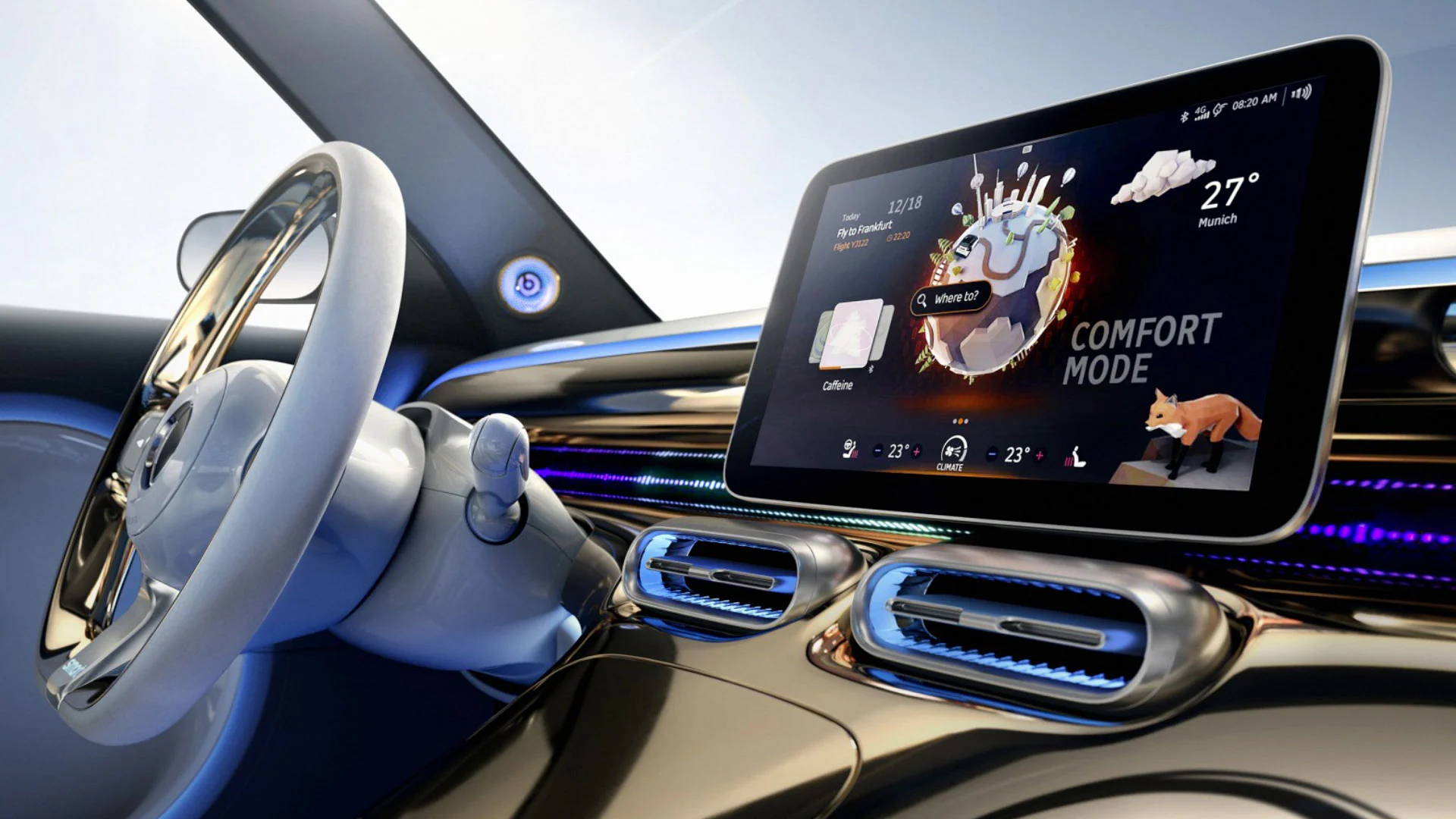 Gli interni della nuova Smart sono audaci quanto gli esterni. Il cruscotto e la console centrale si fondono perfettamente l’uno nell’altro senza quasi un pulsante in vista; un display touchscreen da 12,8 pollici montato centralmente controllerà probabilmente la maggior parte delle funzioni dell’auto.