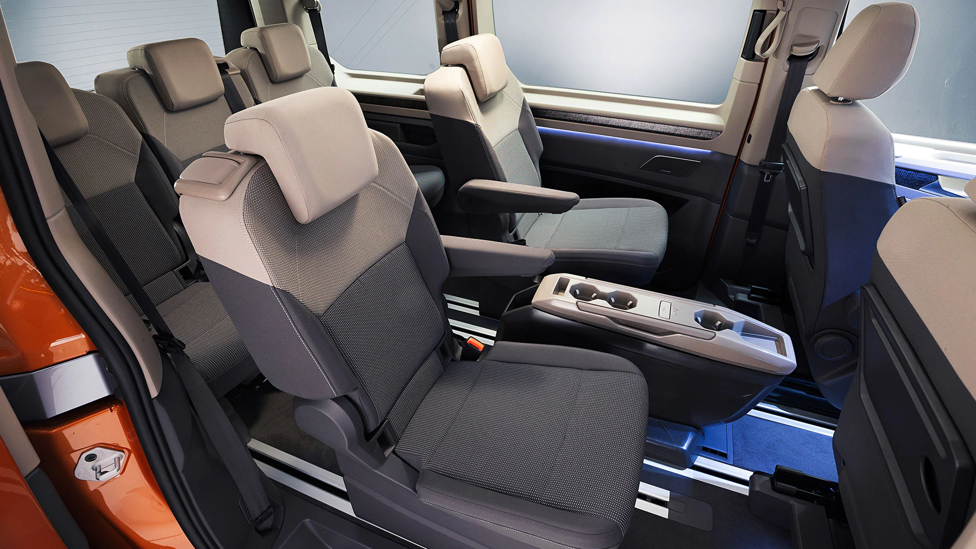 L’interno della nuova VW T7 è dotato di sedili singoli anziché panche e ha un pavimento piatto che si estende per tutto il furgone in modo che tutti condividano la stessa quantità di spazio per i piedi.